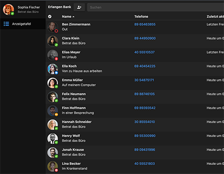 Zeigen Sie das Statusboard Ihres Unternehmens auf Ihrem PC oder Mac an, ohne einen Webbrowser geöffnet zu lassen. Ein schneller Blick zeigt den Status aller Ihrer Benutzer. Sie können Ihr Fenster verkleinern, um es den ganzen Tag über sichtbar zu halten, oder im Vollbildmodus anzeigen, damit es in öffentlichen Bereichen für alle sichtbar ist. Wir bieten eine Listenansicht mit zahlreichen Spalten sowie eine Rasteransicht, mit der zahlreiche Benutzer auf kleinem Raum dargestellt werden können. Beide Optionen bieten mehr Anpassungsmöglichkeiten als je zuvor, um die angezeigten Informationen auszuwählen.