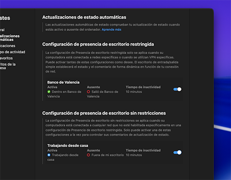 Los administradores pueden establecer múltiples configuraciones de Presencia de escritorio y restringirlas a rangos de direcciones IP específicos. Si tiene una computadora portátil, nuestra aplicación cambiará el estado de actualización automática del estado y los comentarios de Simple In/Out Desktop establecidos en su nombre automáticamente. Perfecto para usuarios que trabajan desde casa.